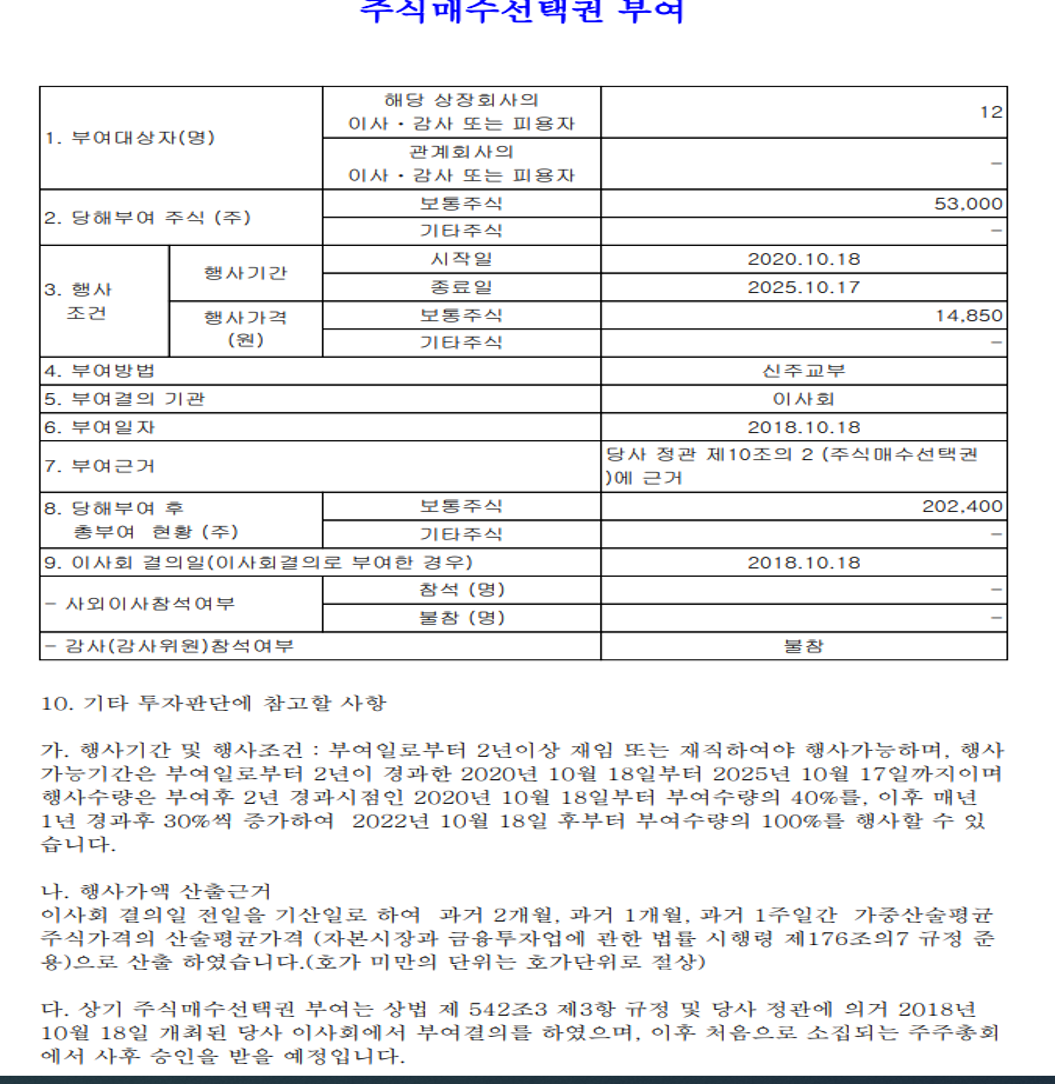 ▶ 위 내용을 보시면, 팬젠에서 주식매수 선택권 5년간 13명에게 부여 해줬는데요. 근데 1분이 퇴사를 하시면서 12명으로 줄어듬으로써 정정보고가 생겼고, 그리고 나머지 12명이 1주당 가격을 14,850원에 매수를 할수 있는 선택권을 부여 받았습니다. 그러니까, 앞으로의 팬젠 1주의 향후 가치가 14,850원 보다 높게 갈 것을 예시 해주었고, 우선 임원들이 53,000주를 당해부여 된 만큼 매수를 한다는 내용입니다. 그러니까 주가는 현재 선반영되서 오를려고 하는 그림입니다.