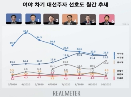 [한국경제TV 김현경 기자] 차기 대권주자 선호도 조사에서 윤석열 검찰총장이 더불어민주당 이낙연 대표와 이재명 경기지사를 바짝 추격하고 있는 것으로 나타났다. 여론조사 전문기관 리얼미