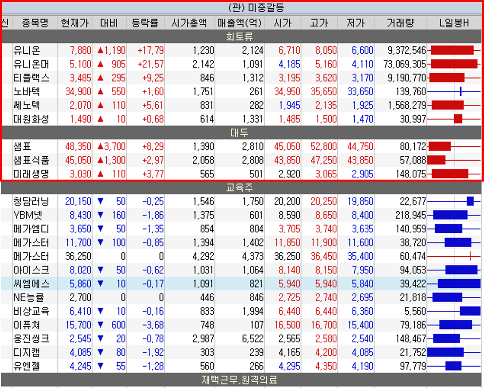 ▶ 관심종목으로 분류해뒀었는데요. 오늘은 다들 빨간불이네요.