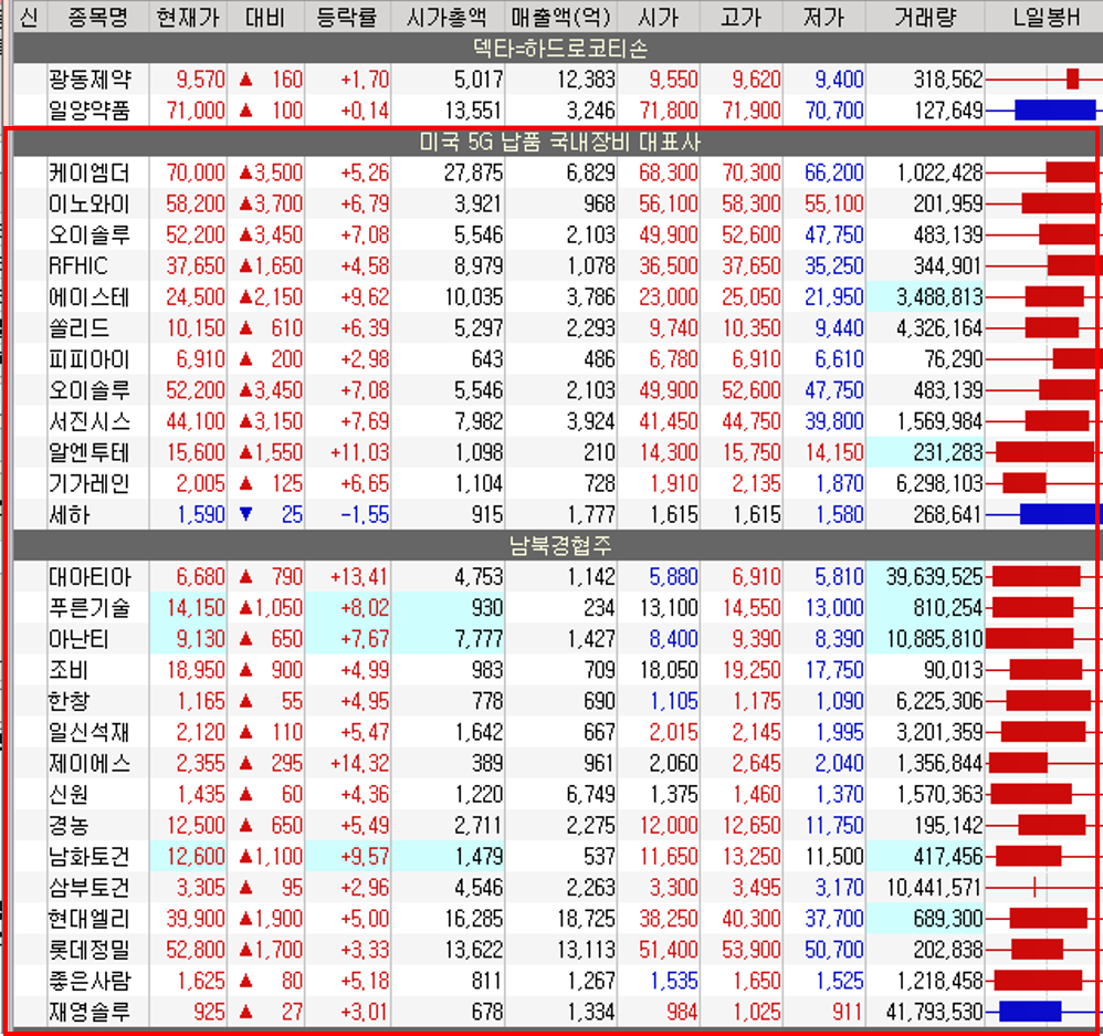 앞서 오전에 포스팅한 것처럼 5G,미중갈등, 남북경협주 들이 움직일것으로 판단하고 있는데요.