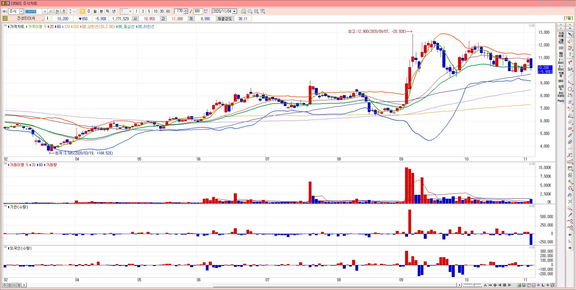우선 첫번째 진성티이씨의 차트인데요. 종가 10,200원( -5.99%)로 마감했습니다.