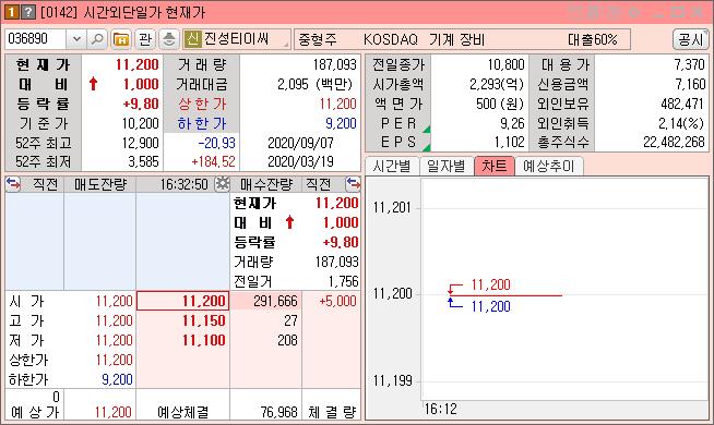 다음은 시간외단일가 현재가창 입니다. 현재 11,200원으로(9.8%) 급등하여... 매물이 없어요ㅠ 사고싶네요