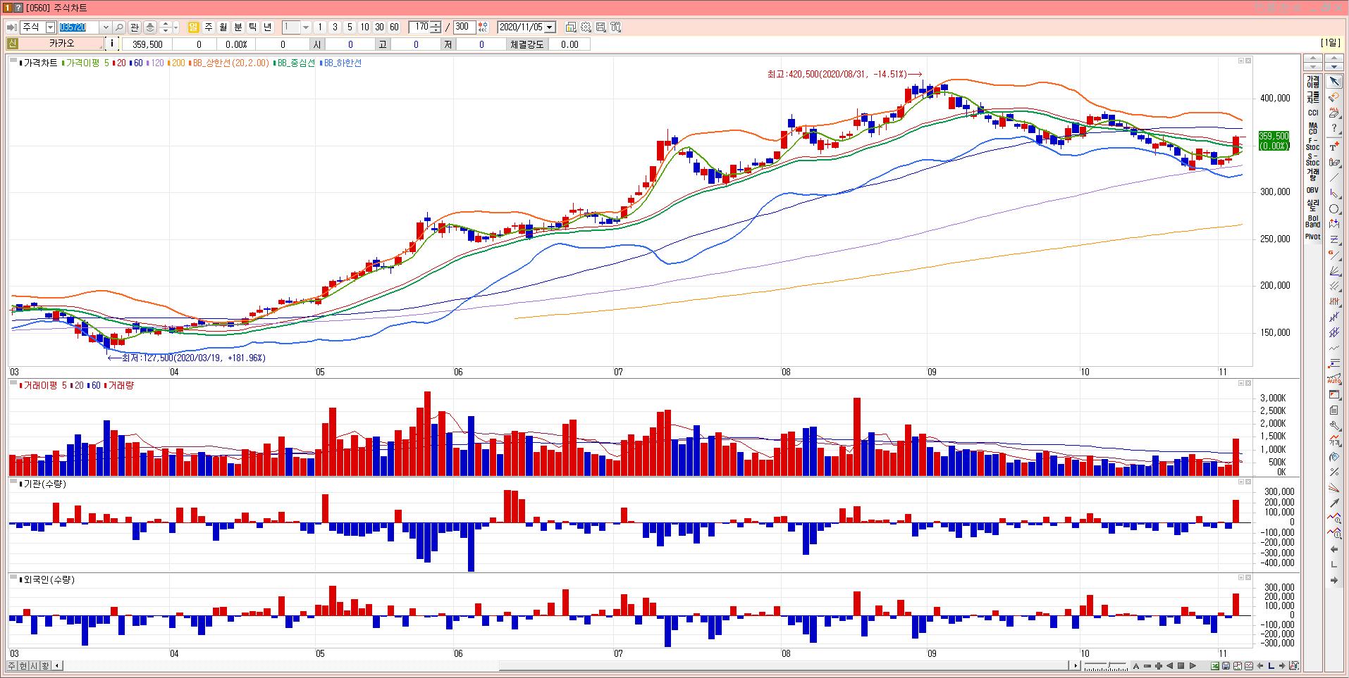 ▶ 언택트 시대에 카카오의 매출에 대한 모두의 기대에 따라 주가가 42만원 때까지 치솟았었는데요. 제 주위에도 현재 고점에 물리신 분들이 많아요. 오늘 이 기사 보시고 다들 힘내셨으면 합니다. ㅎ(카카오는 아직도 성장중이다.)