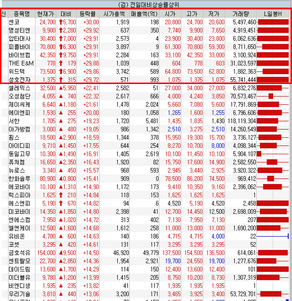 안녕하세요. 오늘 하루도 다들 수고 많으셨어요. 하루의 마무리!! 상승률 상위 종목에 대해 포스팅을 해보도록 하겠습니다.