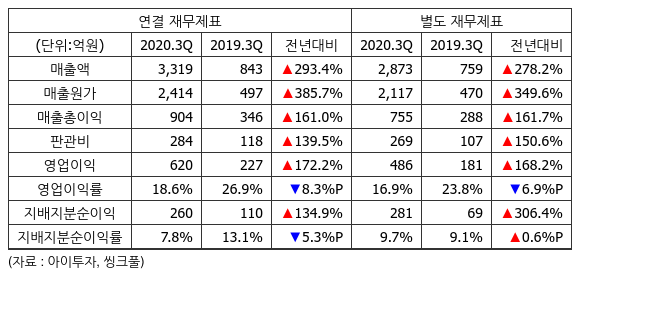 3분기 별도기준 매출액은 2873억5075만원으로 전년 동기 759억7833만원 대비 278.2% 늘었다. 같은 기간 영업이익은 486억2055만원으로 전년 동기 181억2320만원 대비 168.2% 늘었고, 순이익은 281억4312만원으로 전년 동기 69억2500만원대비 306.4% 증가했다.