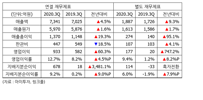 3분기 별도기준 매출액은 1887억9264만원으로 전년 동기 1726억9158만원 대비 9.3% 늘었다. 같은 기간 영업이익은 177억7692만원으로 전년 동기 20억9815만원 대비 747.2% 늘었고, 순이익은 114억6680만원으로 전년 동기 -33억228만원에서 흑자전환했다.