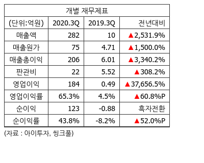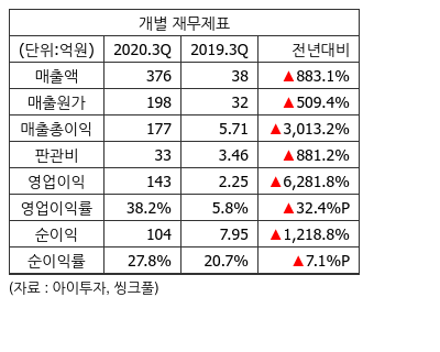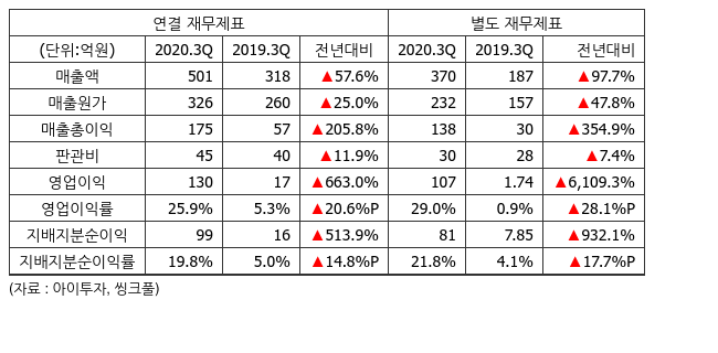 3분기 별도기준 매출액은 370억9971만원으로 전년 동기 187억5867만원 대비 97.7% 늘었다. 같은 기간 영업이익은 107억9396만원으로 전년 동기 1억7383만원 대비 6,109.3% 늘었고, 순이익은 81억619만원으로 전년 동기 7억8535만원 대비 932.1% 증가했다.